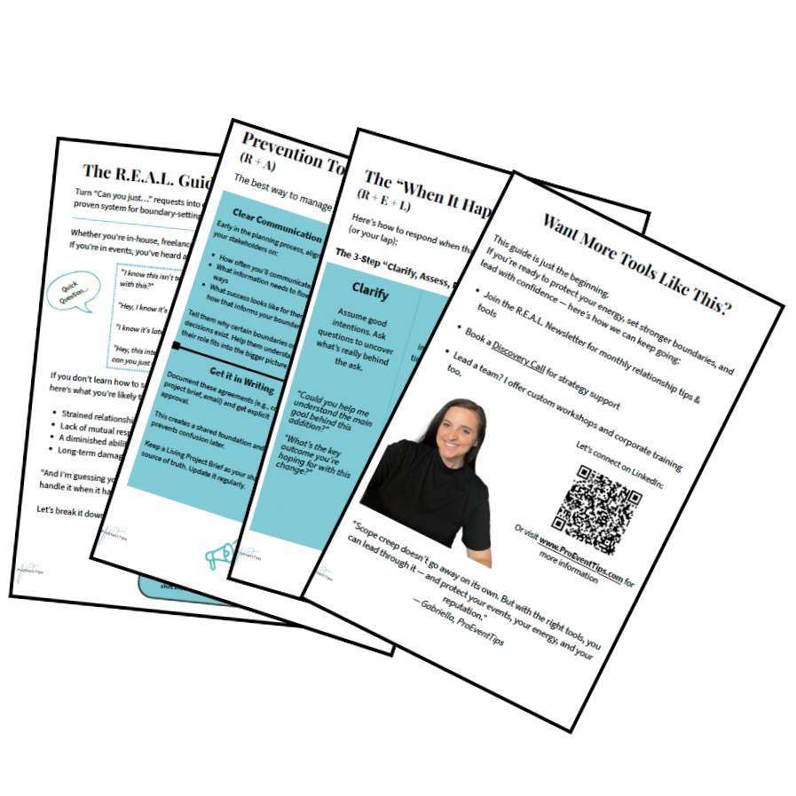 The R.E.A.L. Guide to Scope Creep This free guide is your event-day sanity saver. Inside, you’ll learn how to recognize scope creep early, set clear boundaries with stakeholders, and respond to last-minute changes without losing control, or your cool.It’s packed with practical tools from the R.E.A.L. Event Relationship System™, built specifically for event professionals who are tired of being steamrolled and ready to lead with confidence.Download it now and start protecting your energy, your timelines, and your reputation, one empowered “yes, and…” at a time. Email Address Get it here! We respect your privacy. Thank you!